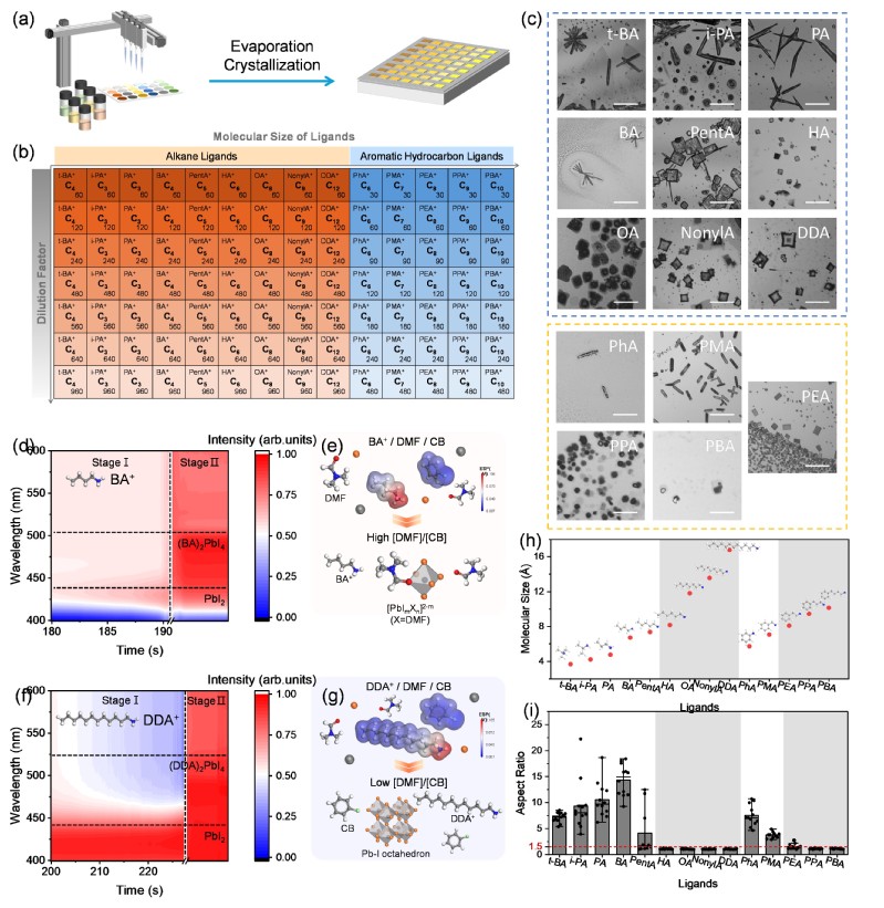 二维钙钛矿的溶液结晶过程受配体结构、溶剂动力学与中间相行为共同影响,传统方法往往依赖经验调节,难以揭示其普适规律。本研究构建了可在数分钟内完成上百组实验的高通量自动化平台,通过调控 14 种不同结构的烷基/芳香胺配体及其稀释条件(图1 a, b),首次系统揭示了“配体尺寸–溶质-溶剂结合能–晶体形貌”间的定量关系(图1 c)。