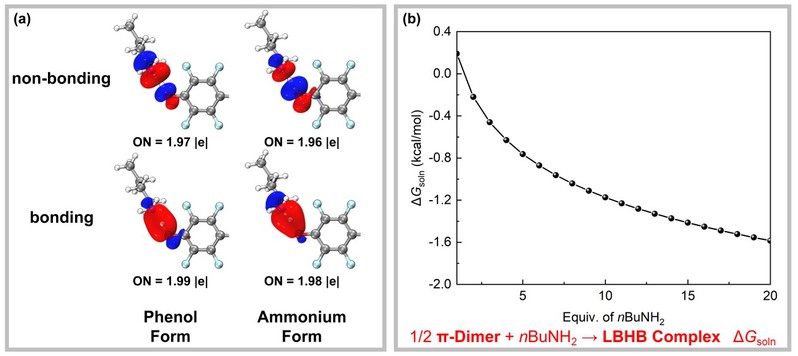 图1. (a) LBHB复合物的4e/3c键合模式图;(b) 解聚反应的溶剂化自由能(ΔGsoln) 随nBuNH2当量数的变化关系
