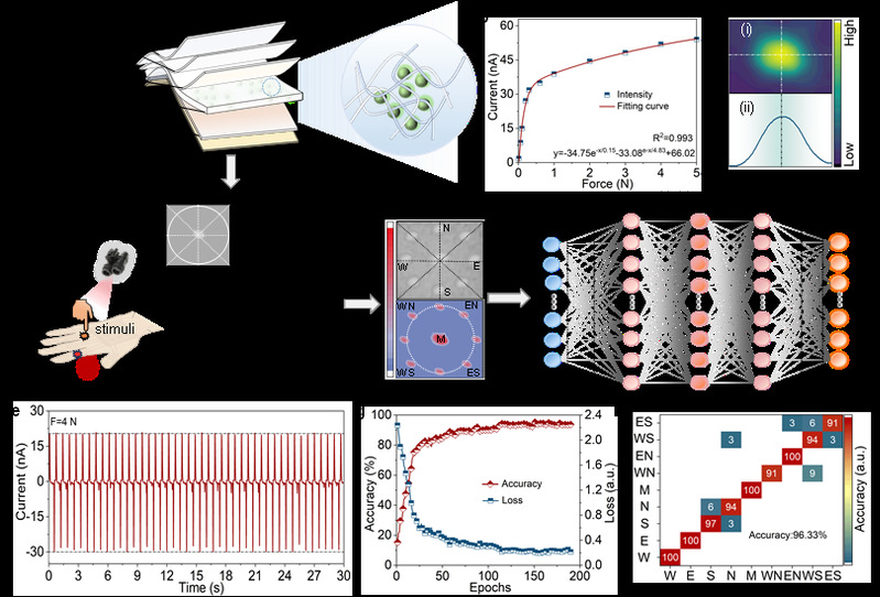 图3 (a)多层结构传感器:MgO: Cr3+/PDMS和MgO: Cr3+/PVDF被包裹在铜膜和ITO膜(b)MgO: Cr3+的稳定电流输出从0.01到5N (c)光学信号输出的传感器(d)多层柔性结构中的原位光电输出原理图以及相应概念验证触觉传感系统的应用 (e)在持续机械刺激下传感器的电学循环测试(f)九个不同位置的ML图片以及相应的二维空间光学映射和神经网络架构(g)识别准确率和损失函数。(h)九个不同位置的预测的混淆矩阵