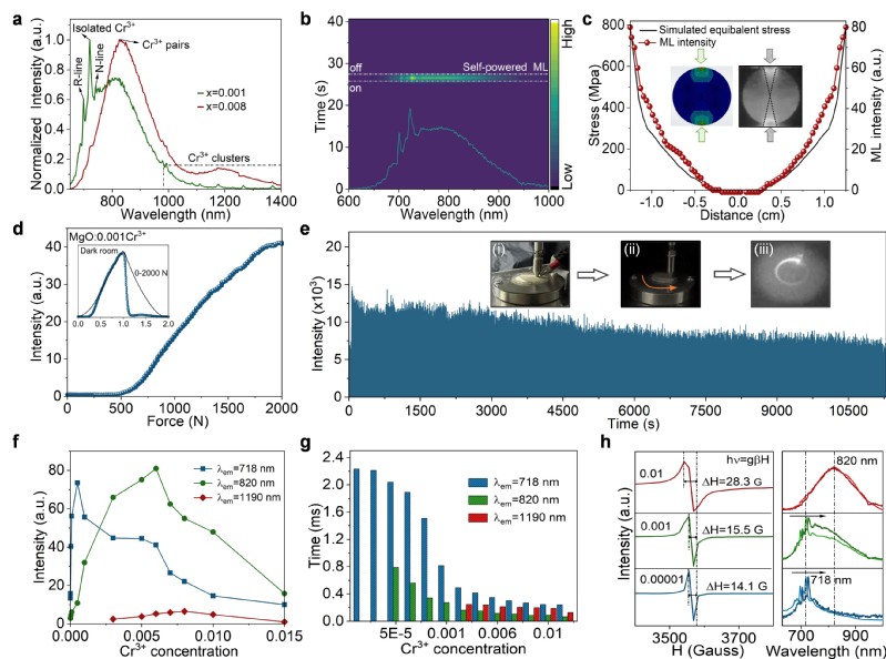 图1(a)Mg1-xO: xCr3+的归一化光谱 (b)MgO: Cr3+的ML二维图 (c)ML实验和模拟应力分布对比图(d)MgO: Cr3+的ML强度随着力变化的对比图(e)ML循环稳定性(f)Mg1-xO: xCr3+的PL强度(g)Mg1-xO: xCr3+的荧光寿命(h)MgO: Cr3+的EPR曲线和相应的ML和PL光谱
