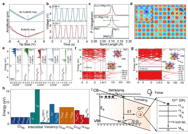 图2 (a)Mg0.999O: 0.001Cr3+和MgO的PFM的振幅和蝴蝶曲线(b)Mg0.999O:0.001Cr3+和MgO的稳定电压输出(c)不同的计算模型下的Mg-O键长分布(d)电荷分布的二维切片(e)不同模型下的COHP曲线(f)MgO的能带、电子态密度和费米能级(g)MgO: Cr的能带、电子态密度和费米能级(h)不同类型缺陷的形成能(i)ML机理示意图