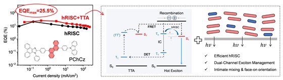 近日,华南理工大学发光材料与器件全国重点实验室的俞越副教授、钟文楷副教授、应磊研究员课题组设计合成新型屈衍生物深蓝光材料PChCz,利用其热激子机制在非掺杂器件中实现21.3%的外量子效率,在此基础上引入三线态-三线态湮灭材料构建双路径激子管理策略,进一步将外量子效率提升至25.5%,并显著抑制效率滚降,为开发高性能深蓝光OLED提供了新思路。