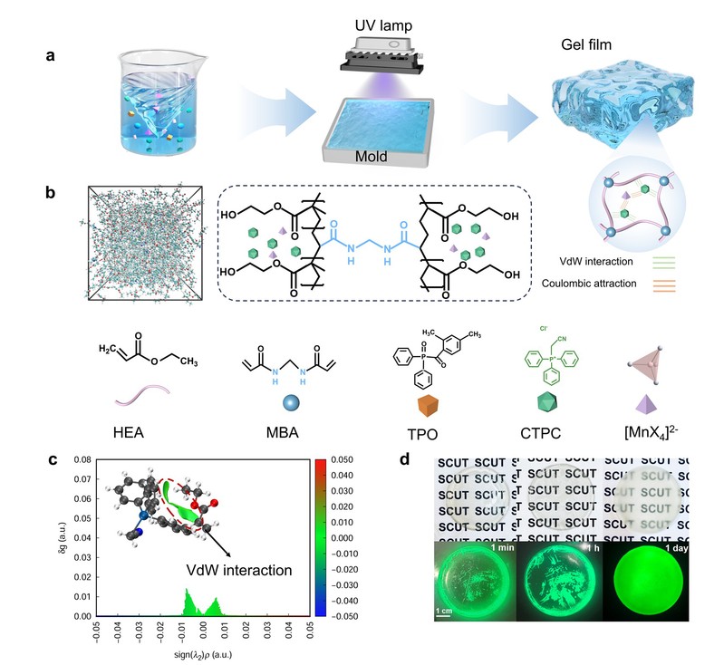 为实现原位应用,团队提出一种基于紫外光聚合的凝胶薄膜制备策略。在聚合物单体中溶解CTP₂MnCl₃Br前驱体,经紫外照射后,单体聚合形成三维网络结构,同时晶体在网络中原位析出,形成均匀分布的透明柔性薄膜。通过分子动力学模拟与IGMH分析,揭示了晶体与聚合物网络之间以范德华力为主的相互作用机制。
