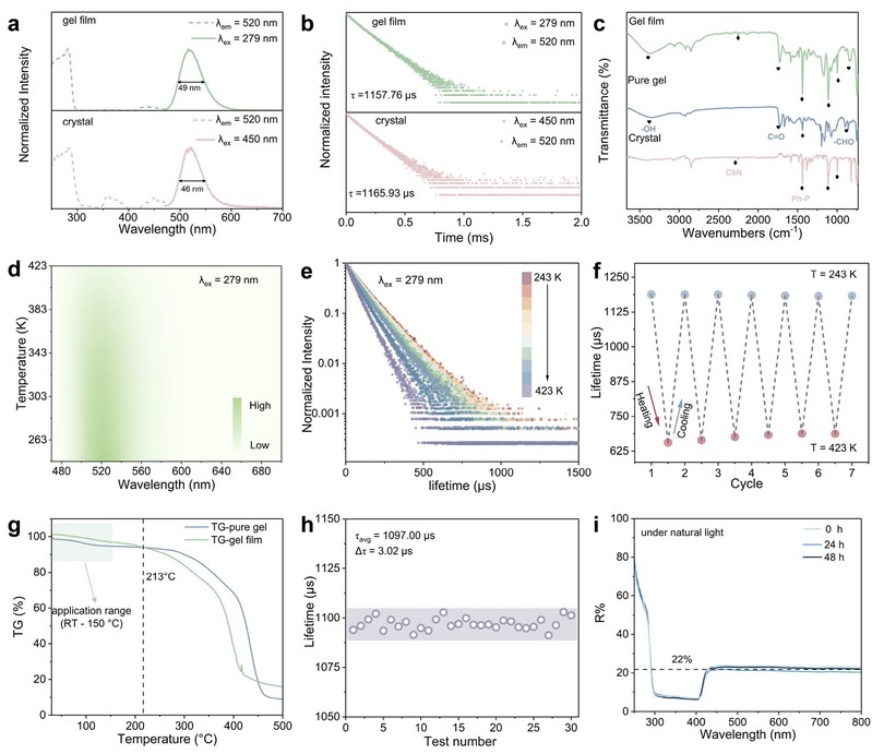 图3CTP2MnCl3Br基凝胶薄膜的荧光特性和稳定性。a. 晶体和凝胶薄膜的PL和PLE光谱。b. 晶体和凝胶薄膜的PL寿命衰减曲线。c. 晶体、纯凝胶和凝胶薄膜的FTIR光谱对比; “♦” 代表晶体的特征峰 “♥” 代表纯凝胶的特征峰。d. 温度测试范围为243 - 423 K的温度依赖的发射光谱(λex =279 nm)。e. 温度在243 - 423 K的晶体PL衰变曲线(λex =279 nm,λem = 520 nm)。f. 凝胶薄膜在243 - 423 K的连续六次冷却/加热循环测试。g. 纯凝胶和凝胶薄膜的TGA曲线。h. 300 K下连续测量PL寿命。i. 凝胶薄膜在连续自然光照射下的漫反射光谱