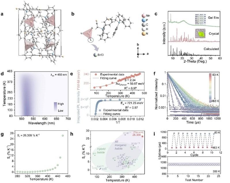 图2 结构和温度依赖的发光特性a. CTP2MnCl3Br的单晶晶体结构。b.有机与无机[MnX4]2-多面体单元的配位结构。c.凝胶薄膜、晶体及单晶的粉末X射线衍射(PXRD)。d. 测温范围为83 - 463 K(λex = 450 nm)的温度相关的发射光谱。e. FWHM以及积分PL强度晶体随温度变化的散点图和拟合的曲线。f. 测试温度在83 – 463 K(λex = 450 nm,λem =520 nm)的温度依赖的PL寿命衰减曲线。g. CTP2MnCl3Br在283 - 463 K温度范围内的Sr计算值。h.关于先前报告的全无机金属卤化物和杂化金属卤化物的相对灵敏度最大值的统计数据。i. 晶体在83 - 463 K的连续10次冷却/加热循环测试以及300 K时连续测试的PL寿命值