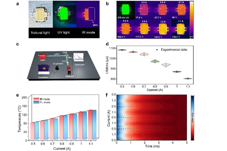 图4 基于寿命测试的凝胶薄膜的温度传感展示。a. 芯片与胶片在自然光、275nm紫外光和热成像相机(顶部放置玻璃片)下的照片。b. 在0.6- 1.1 A不同电流下,热成像相机拍摄的带有凝胶薄膜的LED图像,并附有相应的温度值。c. 本工作所用荧光温度传感测试的示意图。d.凝胶薄膜在0.6 - 1.1 A的驱动电流下的进行了三次测试。e. 不同电流下LED的基于寿命测温模式的温度计算值和红外热成像测试的实际温度值。 f。凝胶薄膜在四个电流增减过程中的PL衰减曲线等高线图。