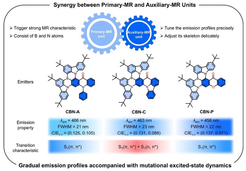 为满足超高清显示对高饱和色彩的严苛要求,有机发光二极管(OLED)领域亟需开发兼具高效率和窄光谱的蓝光材料。多共振热活化延迟荧光(MR-TADF)材料因其能实现窄带发射而备受关注。然而,蓝光MR-TADF材料在追求高色纯度的同时,还需兼顾视觉舒适度,避免因发射波长过短(低于455 nm)而引发“蓝害”。如何在保持高效率的同时,将发射波长调控至视觉友好区域,是该领域面临的关键挑战。