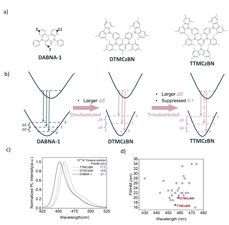 面向超高清显示的深蓝有机发光二极管不仅要求高效率,还要求发射峰位合适、半峰宽窄、色纯度高。然而,现有多重共振热活化延迟荧光蓝光材料在薄膜中往往易发生分子聚集,同时振动耦合引起的发射肩峰也会造成光谱展宽。如何同步抑制分子间堆积与分子内振动耦合,是实现高色域深蓝OLED的关键科学问题。