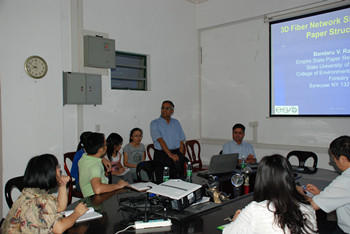 随后,Bandaru V. Ramarao教授和Shri Ramaswamy教授在造纸楼204室为我实验室师生分别作了题为“Research in Papermaking & Paper Physics simulations & Modeling State University of New York. CESF.Syracuse”和“Overview of the Department of Bioproducts & Biosyst-ems Engineering at University of Minnesota Research in the Forest Biorefinery”的学术报告。报告会上,双方就我国目前制浆造纸领域研究情况、产业现状及产业发展规划制定等方面进行了深入探讨和交流。双方一致希望能够进一步开展学术和科研合作,能够建立更全面更深层次的合作关系。