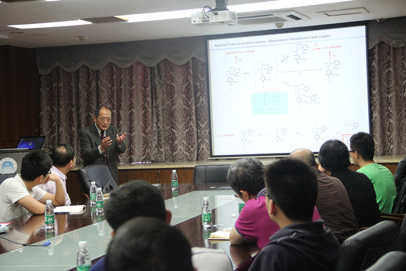 报告会上,Yuji Matsumoto教授重点阐述了芳香烃结构和侧链立体结构是怎样影响木质素的反应活性,并解释了其中的机理。讲述了木质素中β-O-4结构的重要性以及紫丁香基丙烷单元的作用,以及β-O-4模型化合物在碱法蒸煮中的降解反应,使同学们对木质素的结构及其反应机理有了更深的认识。