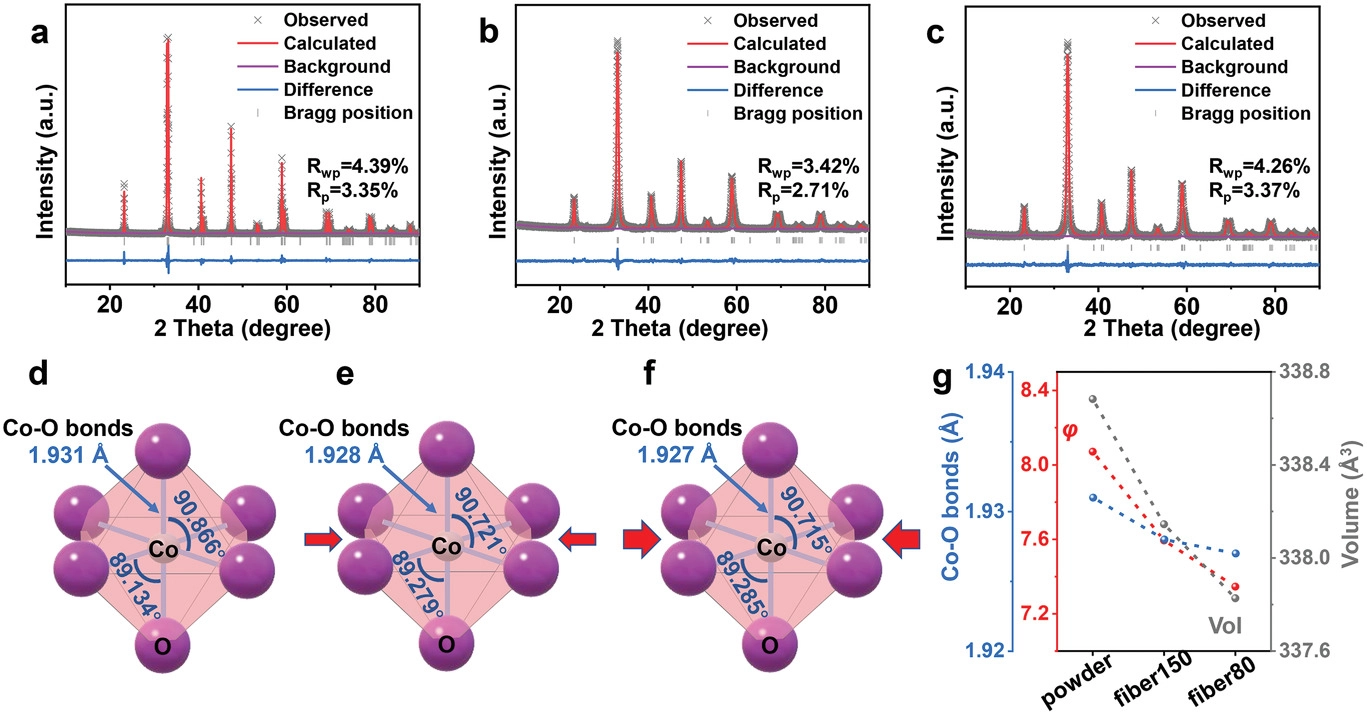 图2. XRD结构精修结果:a) LSC powder、b) fiber150和c) fiber80。LSC中CoO6八面体的键结构:d) LSC powder、e) fiber150和f) fiber80。g) 晶格参数对比:Co-O键键长、晶胞体积以及氧八面体旋转角(φ)。