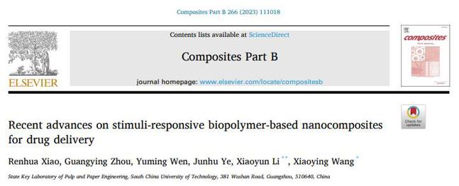 相关研究成果以“Recent advances on stimuli-responsive biopolymer-based nanocomposites for drug delivery”为题发表于《Composites Part B: Engineering》。华南理工大学制浆造纸工程国家重点实验室、轻工科学与工程学院肖人华硕士为论文第一作者,王小英教授和李晓云副教授为论文通讯作者。
