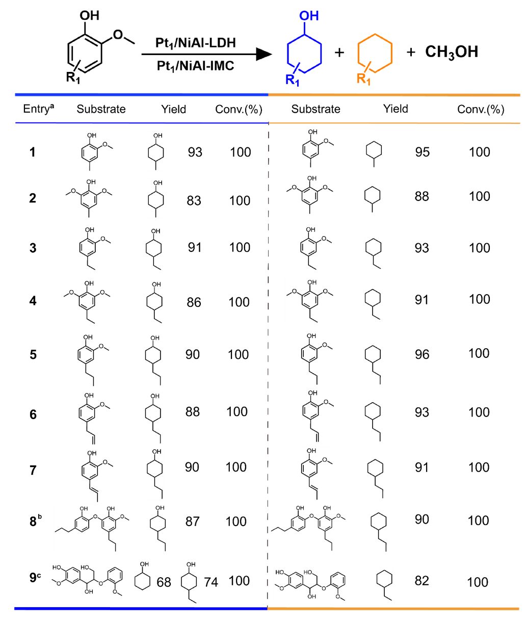 图4. 木质素衍生物的加氢脱氧反应。(a) 反应条件:底物(0.3 mmol)、Pt1/NiAl-LDH(20 mg)、异辛烷(25 mL)、245°C、2.0小时、2.0 MPa H₂、400 rpm;(b) 底物(0.3 mmol)、Pt1/NiAl-IMC(20 mg)、异辛烷(25 mL)、245°C、4.0小时、2.0 MPa H₂、400 rpm;(c) 底物(0.2 mmol)、Pt1/NiAl-IMC(20 mg)、异辛烷(25 mL)、245°C、3.0小时、2.0 MPa H₂、400 rpm。