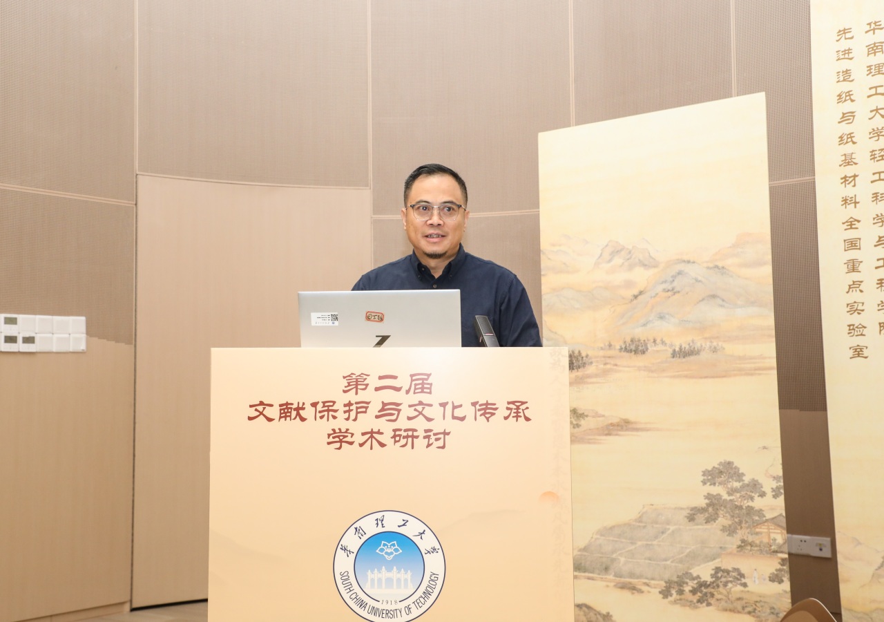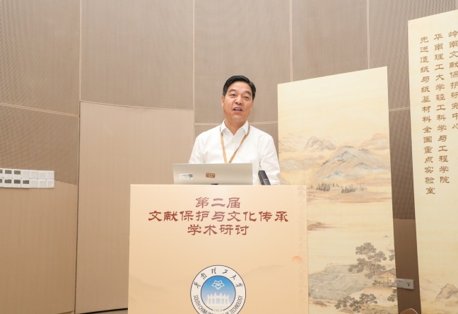 华南理工大学城乡高质量发展研究院副院长娄文勇在致辞中向与会领导和专家表示欢迎和感谢。他指出,文献保护是赓续中华文脉、守护民族精神家园、助力文化强国建设的关键举措,是新时代我们必须肩负的文化使命和历史责任。他回顾了华南理工大学百余年来传承红色基因、弘扬伟大建党精神,坚持以国家文献保护重大需求为导向,构建了从基础研究、技术攻关到成果转化的全链条协同创新体系,为文献保护关键技术的突破提供了有力支撑。他表示,学校将继续强化使命担当,优化学科布局,促进多学科交叉融合,在文献修复技术、保护材料研发和数字化传承等领域持续发力;同时,深化与行业企业合作,加快科研成果转化,着力培养更多适应文献保护事业需要的高素质专业人才,为文化强国与科技强国建设贡献华工智慧与力量。