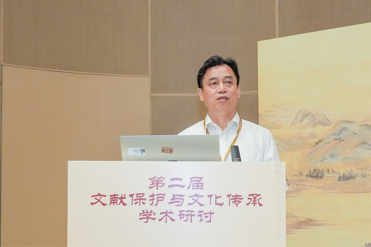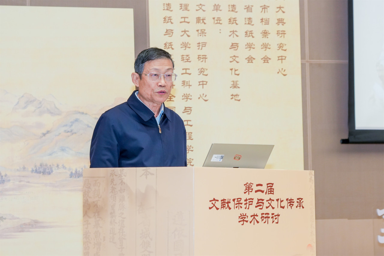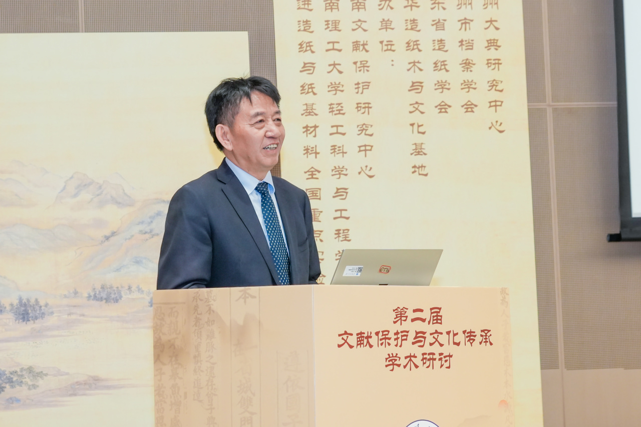 中国档案学会理事长、中央档案馆原馆长、国家档案局原局长杨冬权以《纸质文献的保护》为题作主旨报告。他指出,纸质文献是民族记忆的原点与母体,是文化多样性的基因库,是艺术与工艺的活化石,但在时间的消磨和时代的冲击下,纸质文献正面临来自自然老化、生物侵害、人为损毁等原因造成的损坏和破坏。他倡议,通过“强自身”,即实现增量优质化(使用新型无酸纸、长寿纸)、存量无酸化(进行脱酸处理)以及受损文献的全面修复;“造替身”,即实施异质备份与异地备份;以及“藏好身”,即配备具备“十防”条件的装具与库房设施,为文献提供安全可靠的保存环境,做好纸质文献的保护与传承,守护人类的文化宝藏和精神财富,做好文明的守护人和文化的传承人。