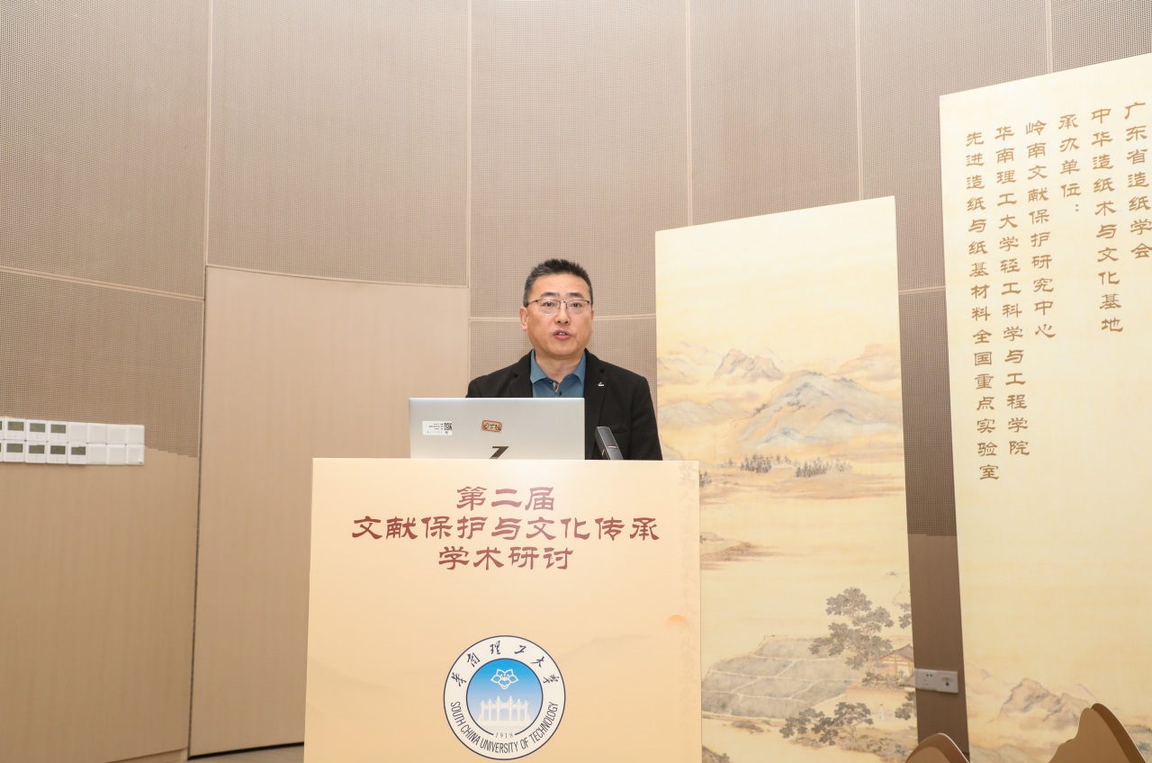 华南理工大学教授、岭南文献保护研究中心主任、大会主席樊慧明以《纸质文献的创新性保护研究》为题作主旨报告。他指出,纸质文献的创新性保护对优秀中华文化传承具有重要意义。他介绍了团队近年来围绕纸质文献保护修复与再造的研究进展,包括从纸的生产工艺技术、原辅料、使用环境等方面分析影响纸质文献老化降解的主要因素,提出民国以来文献相较于古籍更不耐保存的主要原因;为适应文献再造与长久保存需求,研制了《广州大典》耐保存防伪专用纸、宣纸、竹纸、档案用纸等耐保存材料;并针对不同年代、损毁程度、墨迹性能、装帧方式等的历史文献,研制了系列新型脱酸与增强加固材料、智能化批量保护装备、智能分页与超声雾化相结合等的新处理工艺。报告还提出了涵盖纸性能、墨迹等更全面的文献评价指标体系。通过对纸质文献与电子文献的优劣对比,他明确指出纸质文献是最具历史和收藏价值、寿命长、可追索、最好的存贮介质。同时指出考虑到文化传承与传播的不同需要,纸质文献将与电子介质并存发展,以充分发挥两者的优势。