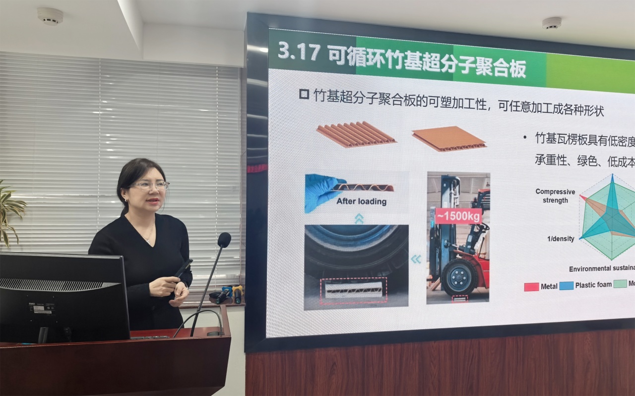 中国林业科学研究院卢芸研究员以《超分子科学赋能:打造新一代竹基颠覆性材料》为题,展示了通过超分子调控提升竹材性能的创新路径,助力“以竹代塑”与循环经济发展。报告重点阐述了通过调控三组分相互作用提升竹材性能的研究工作,并介绍了研发无胶黏剂的可循环竹基超分子聚合板的实例。