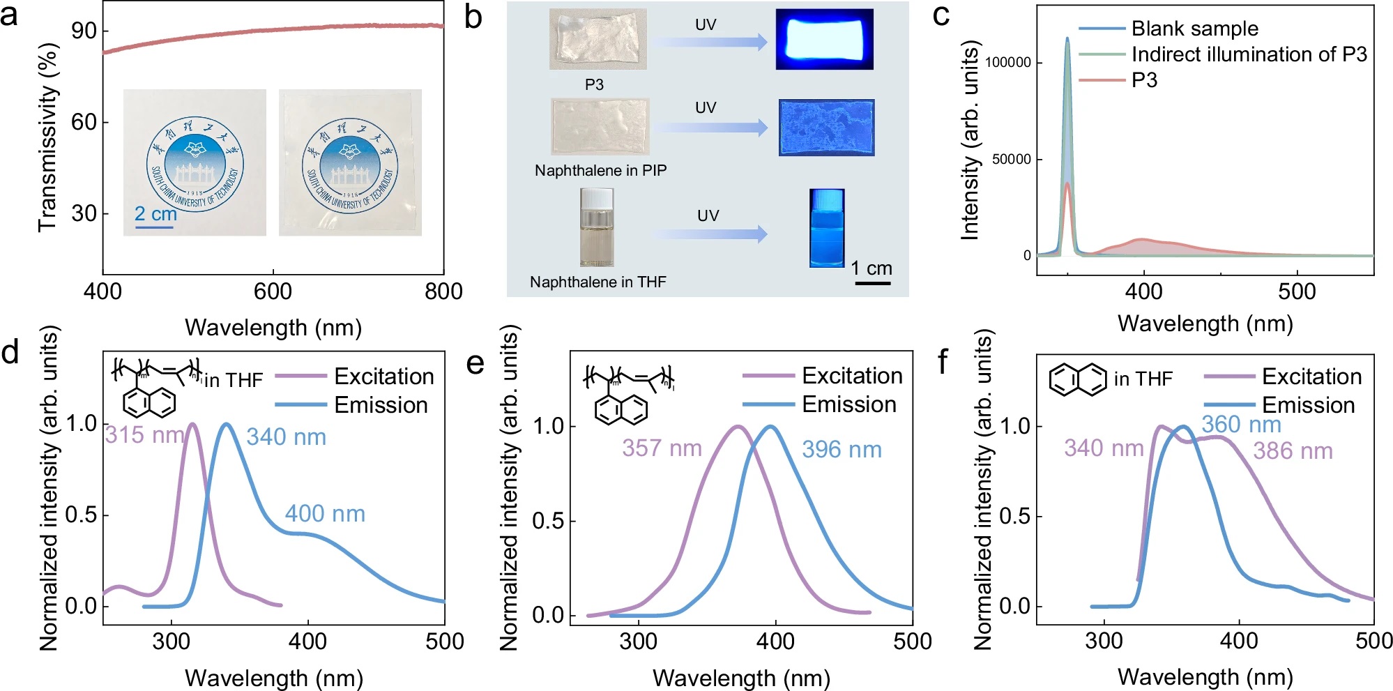 华南理工大学前沿软物质学院、先进造纸与纸基材料全国重点实验室王号兵教授、周嘉嘉教授及澳门大学钟俊文博士团队将纳米级萘 - 萘微相分离引入聚异戊二烯基质中,使烯烃共聚物在无外部刺激的室温条件下具备优异的力学性能、高柔韧性和本征自修复能力。值得注意的是,通过采用 “聚合物受限激基复合物” 策略,这些共聚物展现出卓越的光致发光性能,借助萘 - 萘激基复合物的形成实现了超高光致发光量子产率(PLQY>98%)。实验与理论分析表明,在柔性顺式 - 1,4 - 聚异戊二烯链段的包裹作用下,纳米级萘聚集体在紫外光刺激下形成稳定的激基缔合物,从而产生极高的荧光量子效率。此外,萘的纳米级聚集赋予这些共聚物优异的驻极体性能,使其成为适用于机械手等设备的光 - 电 - 力传感器的理想材料。