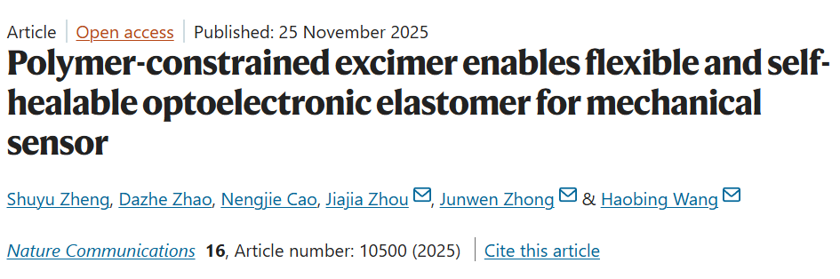 Polymer-constrained excimer enables flexible and self-healable optoelectronic elastomer for mechanical sensor;Nature Communications;Shuyu Zheng, Dazhe Zhao, Nengjie Cao, Jiajia Zhou, Junwen Zhong, Haobing Wang.