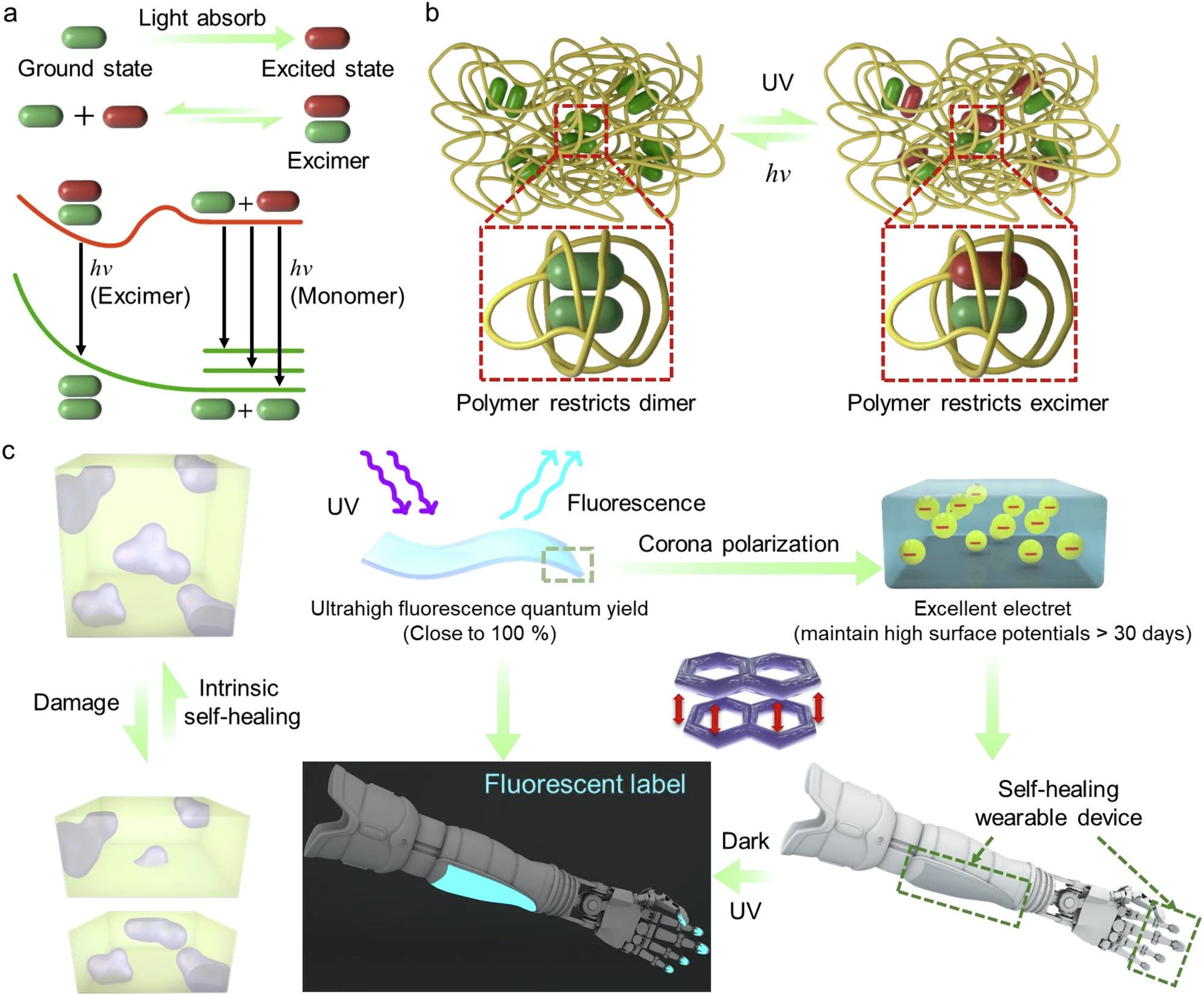 图1:展示了聚合物设计和多功能集成的分子机制,包括激基复合物的形成机制以及聚合物限制策略如何实现高荧光效率和自修复能力。
