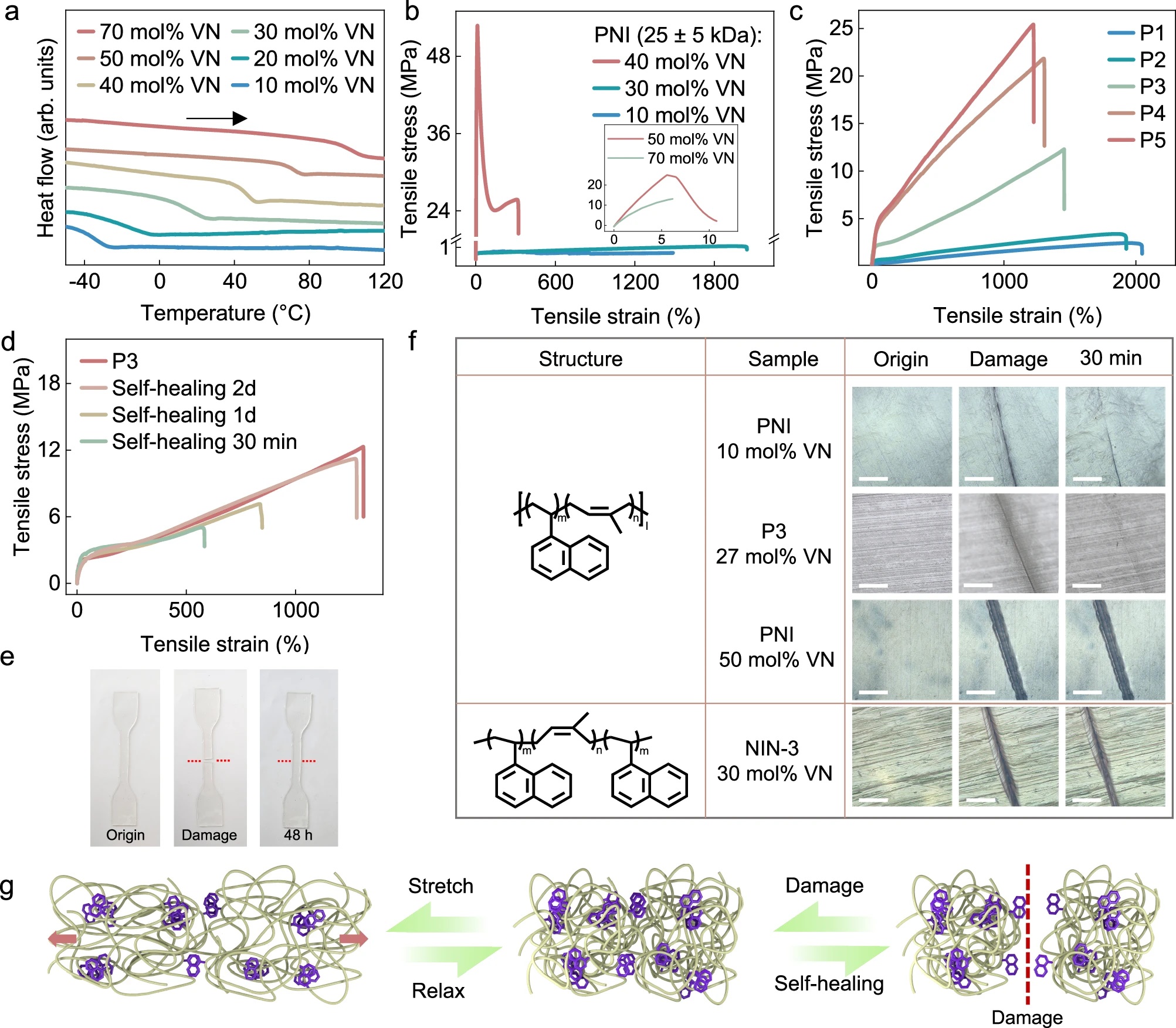 图3:系统研究了不同VN含量与分子量对材料力学性能与自愈合行为的影响,P3样品在室温下实现快速自愈合。