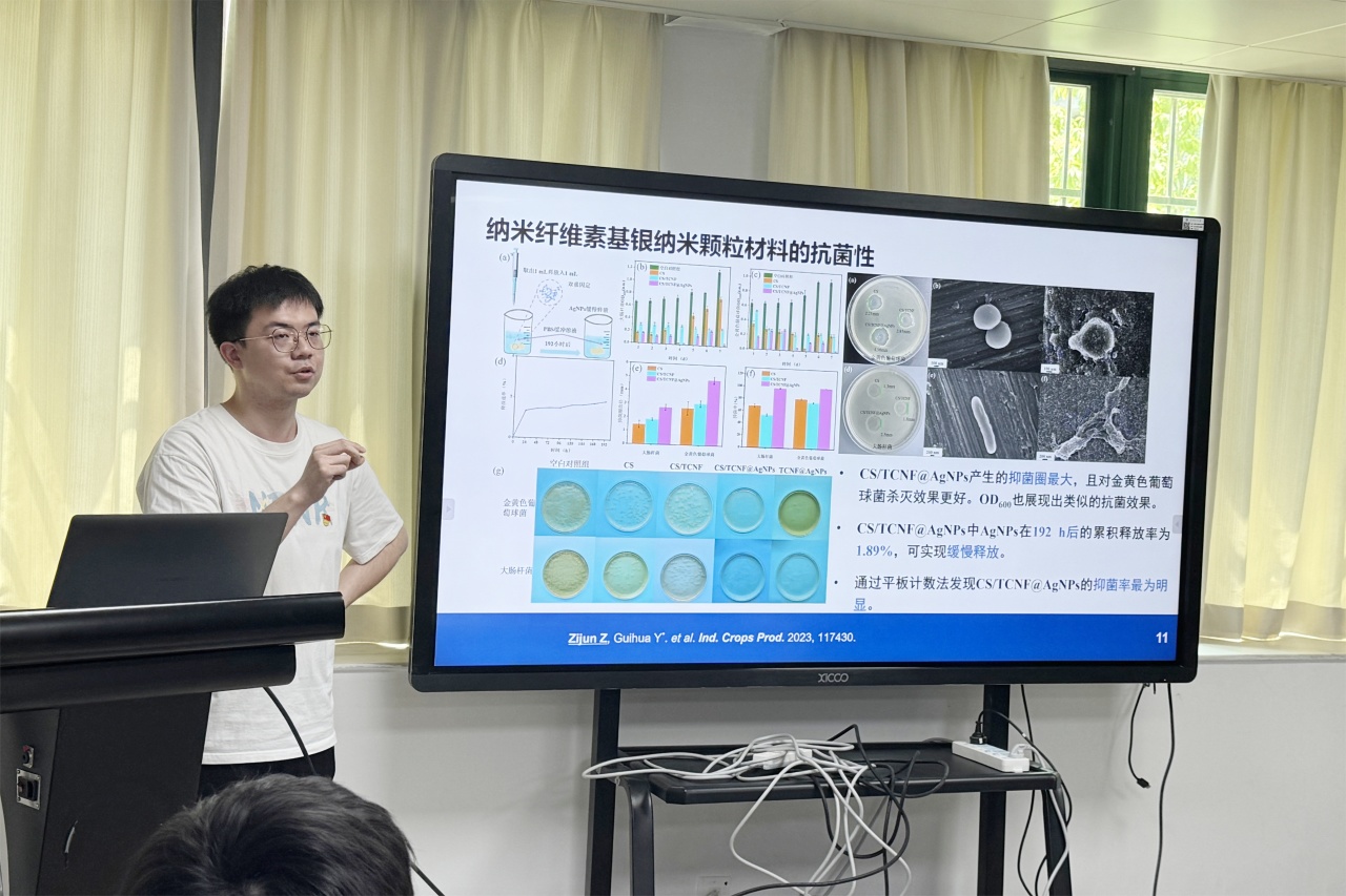 学术报告环节,张子俊博士以《纳米纤维素基银纳米材料的构筑》为题作学术分享。他围绕纳米纤维素与银纳米材料的协同构筑,从银纳米颗粒(AgNPs)、银纳米团簇(AgNCs)到复合膜、复合海绵与功能油墨等体系,系统介绍了相关材料的设计思路、制备方法、结构表征及应用进展。报告指出,纳米纤维素不仅具备生物相容性、可再生性和良好的结构可调性,还可为银纳米材料提供稳定载体与微环境,从而改善其分散性、释放行为和加工适应性。相关研究表明,所构筑材料在抗菌保鲜、果蔬贮藏调控及荧光防伪印刷等领域表现出良好的功能响应与应用前景,为绿色功能材料的精准构筑及其在食品包装与光学信息防伪领域的高值化应用,提供了新的理论依据与实现路径。