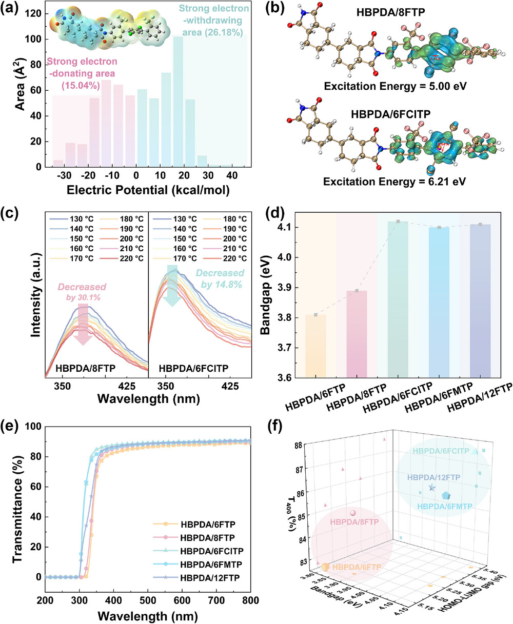 图3. 电荷转移分析与光学性质 (a) HBPDA/6FCITP的ESP分布。(b) HBPDA/8FTP和HBPDA/6FCITP的Chole-Cele等值面图。(c) HBPDA/8FTP和HBPDA/6FCITP在130°C至220°C范围内的荧光发射光谱。(d) 通过Tauc plot测量的聚酰亚胺薄膜的光学带隙。(e) 聚酰亚胺薄膜的紫外-可见光谱。(f) 带隙、HOMO-LUMO能隙与T₄₀₀之间的关系。