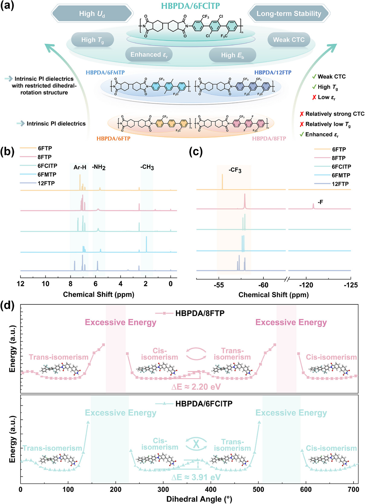 图1. 聚酰亚胺结构的设计与表征 (a) 所设计的本征型聚酰亚胺电介质的构效关系示意图。(b) 三联苯二胺的¹H NMR谱图。(c) 三联苯二胺的¹⁹F NMR谱图。(d) HBPDA/8FTP和HBPDA/6FCITP的二面角-能量关系图。