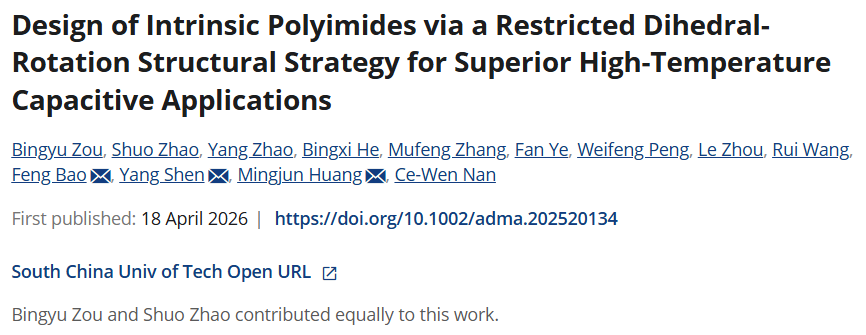 相关研究成果以“Design of Intrinsic Polyimides via a Restricted Dihedral-Rotation Structural Strategy for Superior High-Temperature Capacitive Applications”为题发表于《Advanced Materials》。论文共同第一作者为华南理工大学博士生邹秉钰和清华大学博士生赵硕,共同通讯作者为华南理工大学黄明俊教授、博士后鲍峰和清华大学沈洋教授。该研究工作得到了先进造纸与纸基材料全国重点实验室自主研究课题基金(2024ZD06)等的资助。