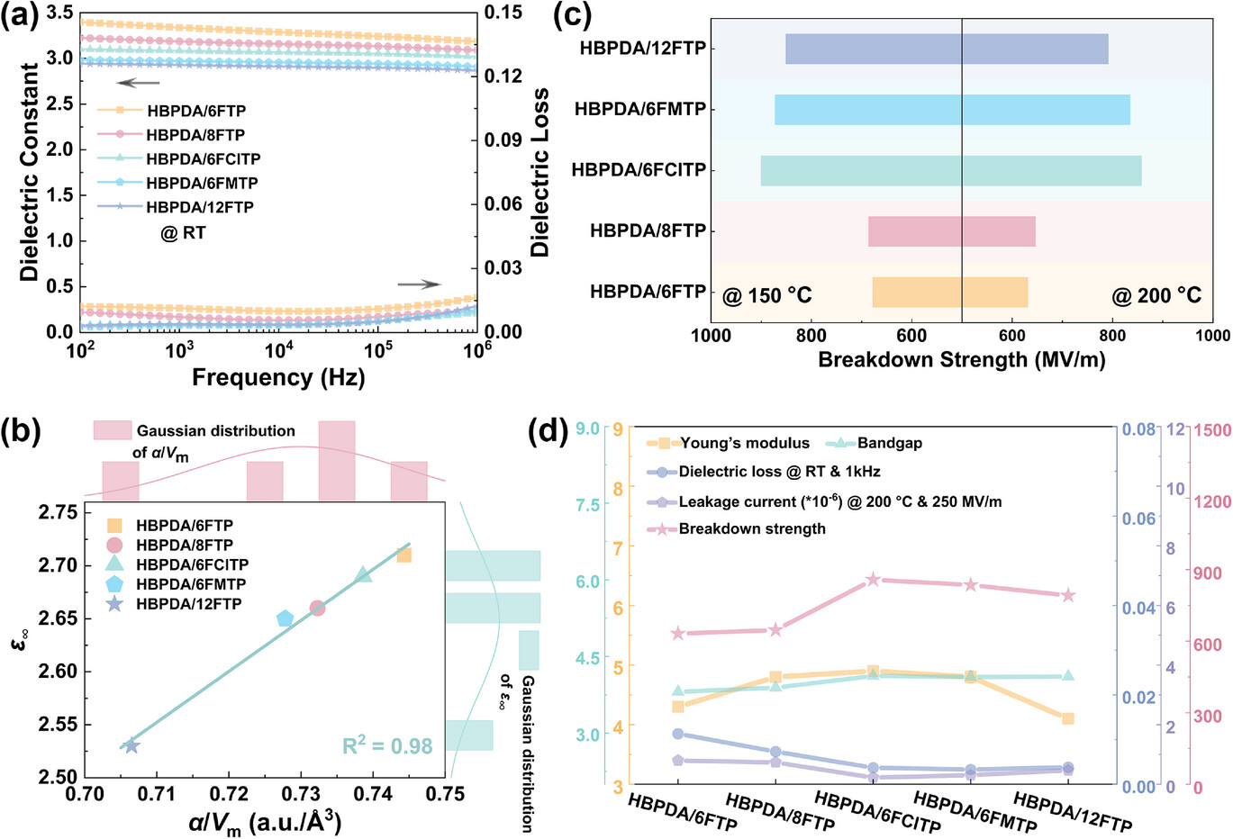 图4. 介电性能分析 (a) 室温下聚酰亚胺薄膜的介电常数和损耗因子。(b) α/Vm-ε∞关系图。(c) 聚酰亚胺薄膜在150°C和200°C下的韦伯击穿强度。(d) 击穿强度与其影响因素之间的关系。