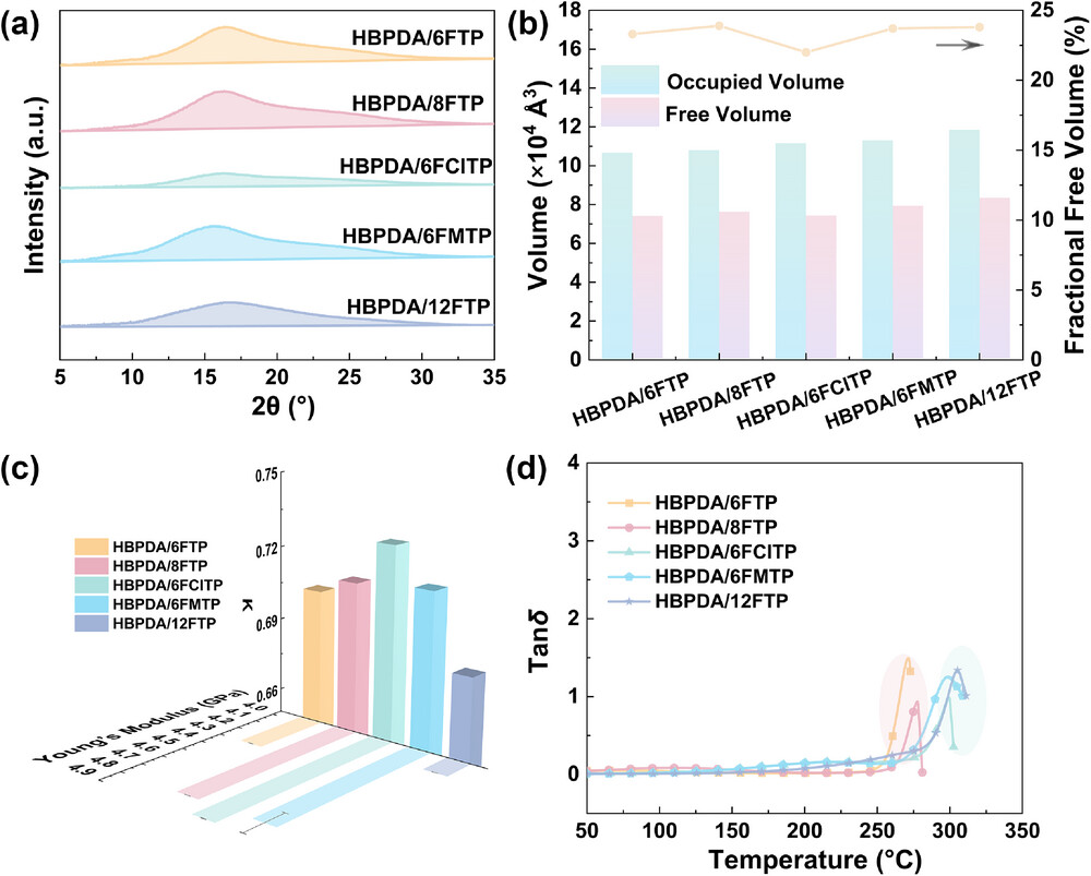 所有聚酰亚胺薄膜的广角X射线衍射图谱均呈现宽泛的弥散峰(图2a),表明其为无定形结构。这主要归因于大体积的HBPDA单元与受限二面角旋转结构共同破坏了聚合物链段的规整排列。其中,HBPDA/6FCITP具有最高的堆积系数(K=0.7279)和最低的自由体积分数(21.9%),表明其分子链堆积最为致密。这种致密的凝聚态结构直接体现在力学性能上——HBPDA/6FCITP的杨氏模量高达4.9 GPa,在所有样品中最高,且与堆积系数呈正相关关系(图2c)。动态力学分析(图2d)显示,所有聚酰亚胺薄膜的玻璃化转变温度在271°C至305°C之间,其中HBPDA/6FCITP、HBPDA/6FMTP和HBPDA/12FTP均表现出298°C至305°C的更高玻璃化转变温度,证实受限二面角旋转结构显著增强了分子链刚性。