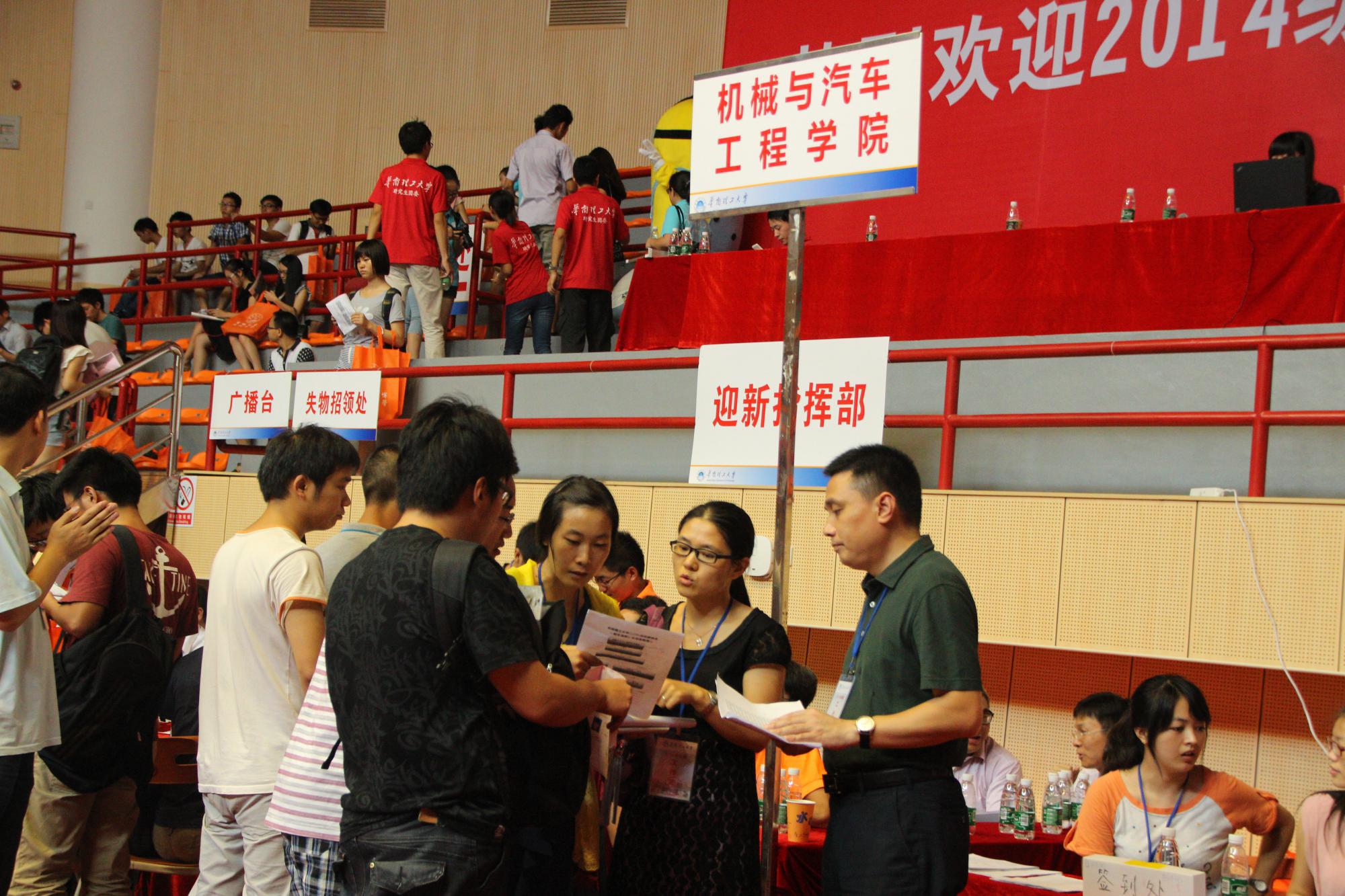 9月6日上午8时,学院团总支、研分会的同学早早地在文体中心设置了迎新接待点,为提前到来的新生热心解答。下午13时,注册正式开始,负责迎新的工作人员各司其职,迎新工作有条不紊地进行。炎炎夏日的文体中心外,机汽学院的师兄师姐们以热情的微笑迎接着每一个新生,不辞辛劳地为新生看守行李;热火朝天的文体中心内,师兄师姐们认真地指导新生填写注册表,不厌其烦的细心讲解。