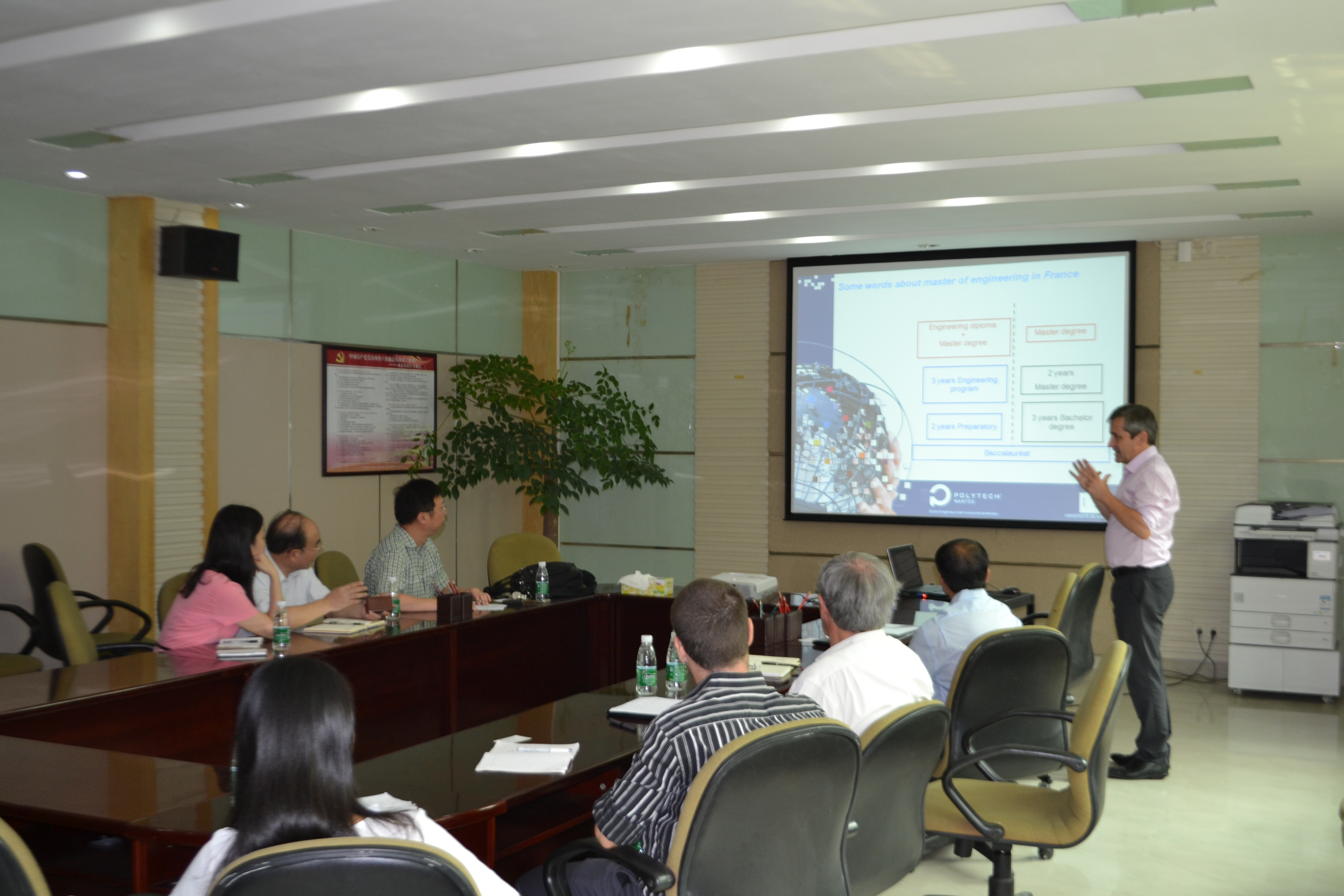 会谈过程中,René Le Gall教授介绍了南特大学综合理工学院的概况,法国的教育体制,对比了工程师院校与普通大学在培养方式上的不同之处,并表达了与我院建立合作的意愿。上官文斌教授代表学院,介绍了我院的概况。在会谈过程中,双方决定以“3+1+2”的模式联合培养学生。项目的主要模式如下:学生4年的本科教育在华南理工大学进行,包括完成本科学习和法语培训。其中“3”是指学生前3年在机械学院学习,“1”是指学生第4年进入中法工程师学院,学习法方专业预备课程、中方专业硕士部分必修课程以及进行法语强化培训,期满符合要求者,将被授予华南理工大学学士学位。“2”是指硕士阶段的两年赴法国南特大学综合理工学院或法国大学高等工程师联盟高校,进行工程师最后两年的课程学习,并完成中方部分专业硕士课程,期满符合要求者,将被授予华南理工大学专业硕士学位以及法国接收高校的工程师文凭。
