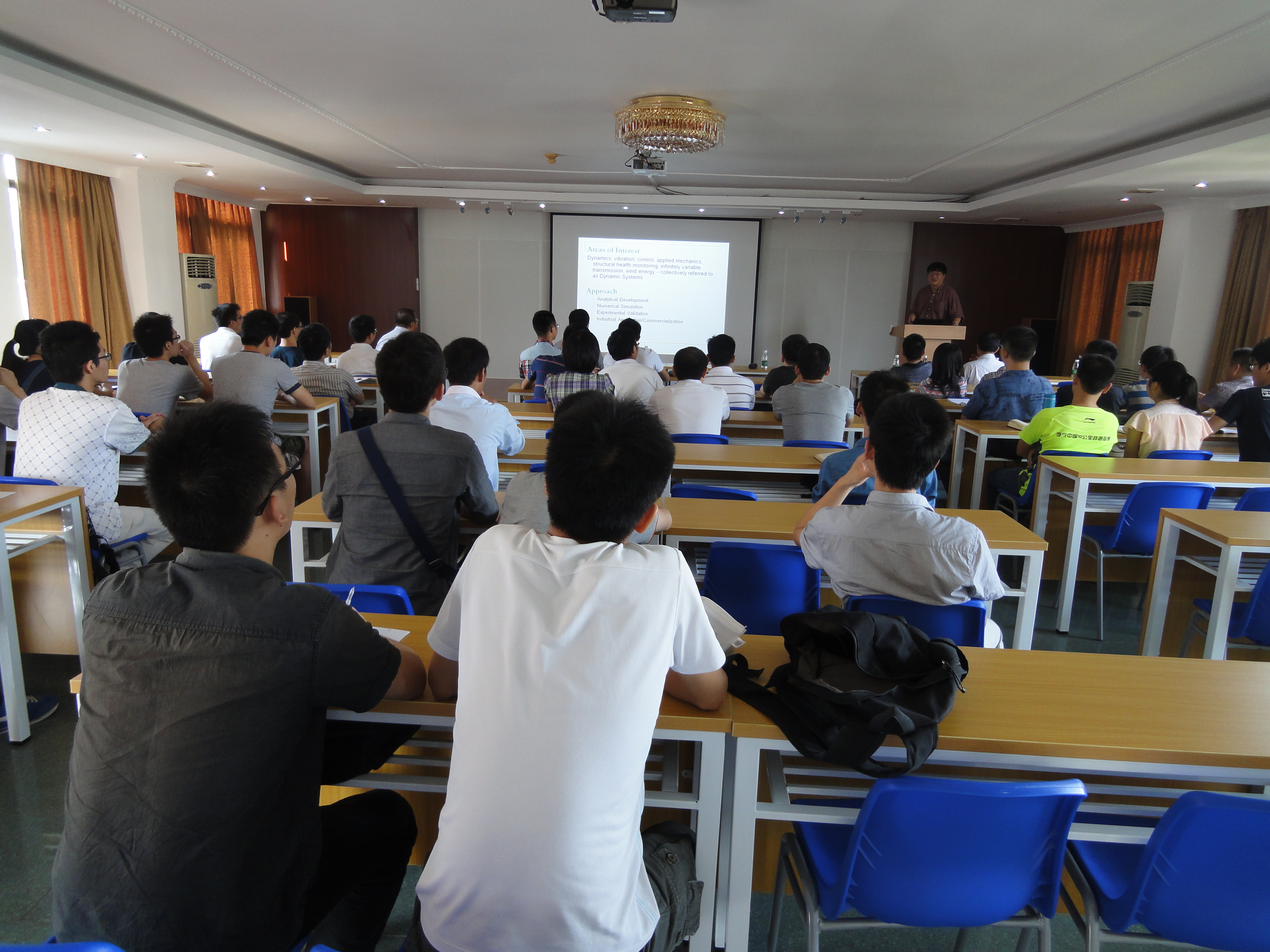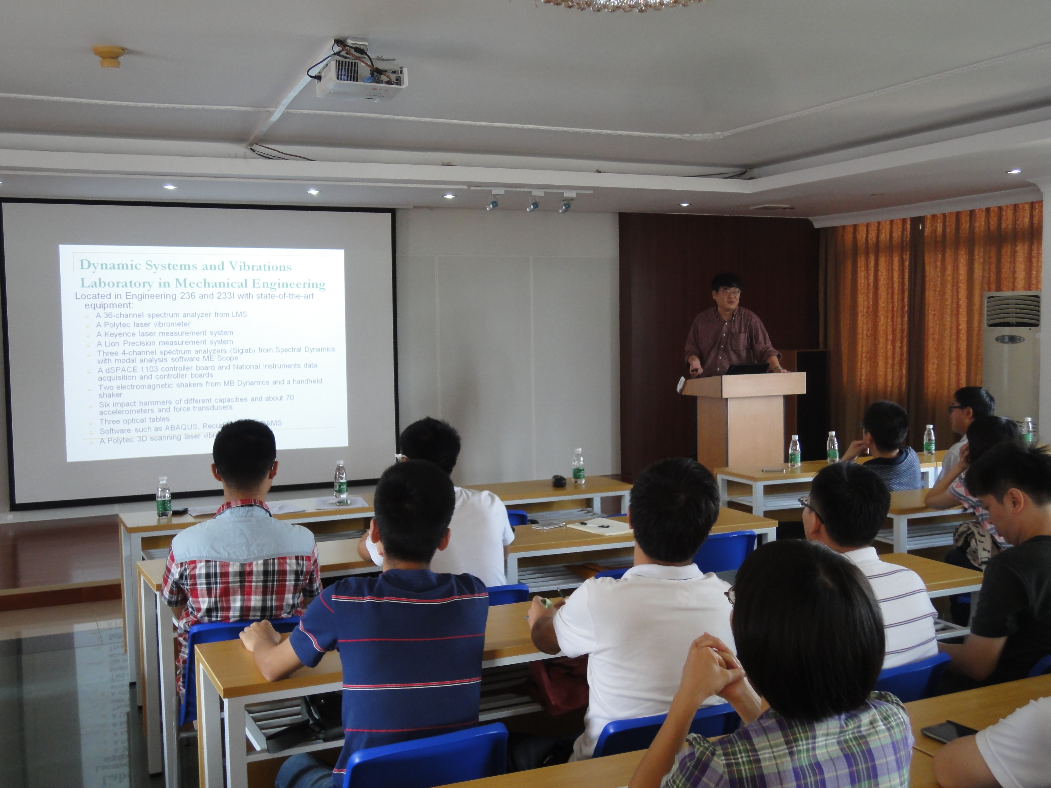 2014年10月27日上午,美国马里兰大学朱伟东教授到我校召开题为:Recent Advances in Dynamic System Research: From Vibration ofDistributed Structural Systems to Vibration-based Damage Detection andInfinitely Variable Transmission的学术讲座。