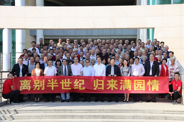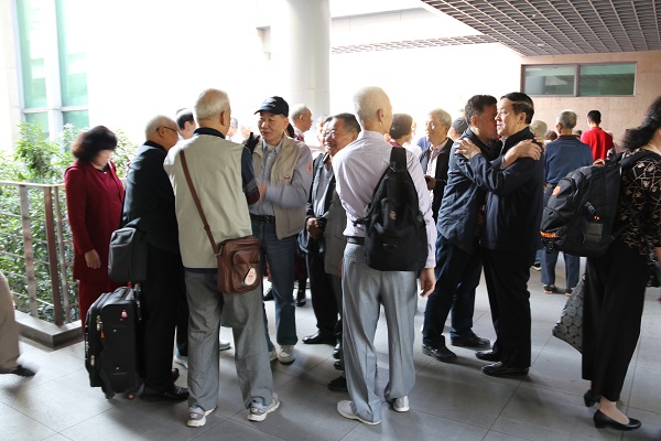 早上8:30,便有校友提前来到聚会现场,期待与分别已久的同学见面,再续同窗情。随后,各位校友陆陆续续来到聚会现场,每当一位老友来到,校友们都欢声相迎,或握手或相拥,尽管时光已过去半百,但校友都能清晰地记住对方的名字、外号、职位,一见面便能脱口而出:“小张,好久不见啊”、“班长!你也来那么早啊”。更有的校友开起了玩笑:“你是谁?怎么变成了这个样子。”久别的重逢、迎面扑来的美好华园回忆让校友们个个都乐开了花。还未到聚会时间,会议室门口便挤满了返校的校友,他们在回忆着难忘的校园生活,在分享着过往有趣的人生,在感慨着岁月的匆忙与校园的变化。