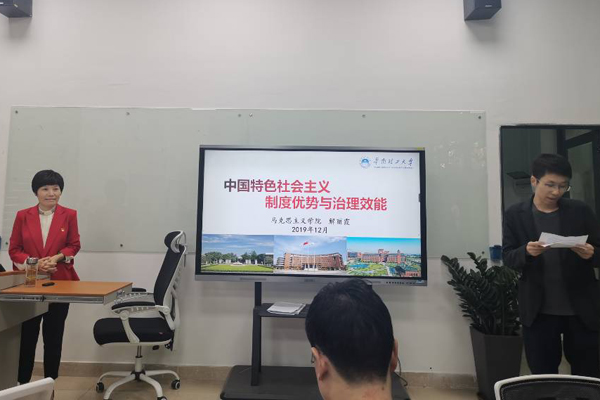 活动内容:12月12日下午,工程训练中心党支部和工业装备与控制工程系党支部,联合邀请华南理工大学马克思主义学院院长解丽霞,作题为《中国特色社会主义制度优势与治理效能》的专题辅导报告,深入学习贯彻党的十九届四中全会精神。工程训练中心党支部书记鲁忠臣主持报告会。工程训练中心党支部和工业装备与控制工程系党支部党员参加学习。
