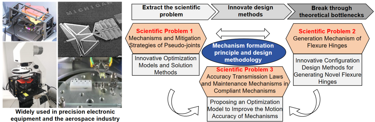 For high-end equipment whose primary function is realized through mechanical motion, the foremost challenge in original research and development is mechanism design. Research in this direction includes: mechanism formation principle and design methodology for compliant mechanisms; configuration synthesis and optimal design of serial and parallel rigid robot mechanisms; and static/dynamic modeling and analysis of robot mechanisms.