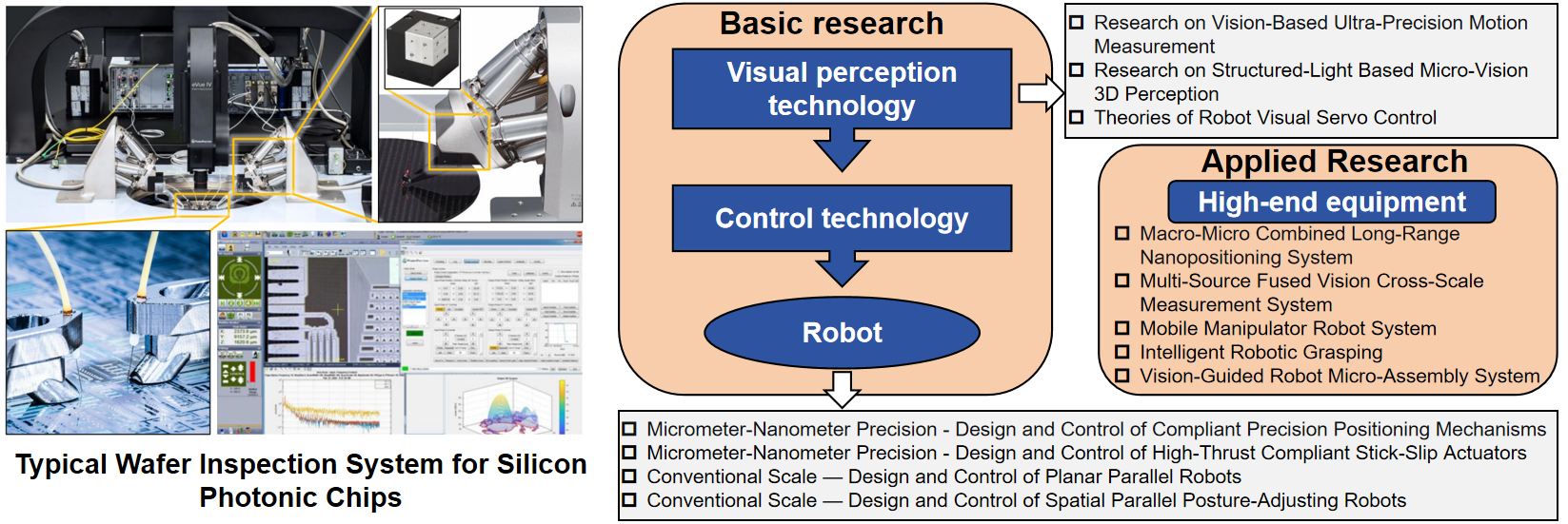 This direction integrates the aforementioned technologies in mechanism design, intelligent perception and decision-making control technologies, conducting research on system integration and application of high-end intelligent equipment in the context of industrial and sector needs. Main research areas include: fundamental research on micro-nano operating systems based on compliant mechanisms and micro-vision; key technologies and systems for adaptive assembly of cross-scale micro-parts; and research and development on key technologies and complete sets of equipment for crystalline silicon solar photovoltaic cell laser printing and semiconductor digital lithography.