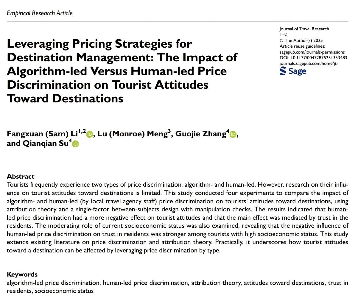 发表于《Journal of Travel Research》的论文《Leveraging Pricing Strategies for Destination Management: The Impact of Algorithm-led Versus Human-led Price Discrimination on Tourist Attitudes Toward Destinations》(李芳轩为第一作者),聚焦算法主导与人为主导两种价格歧视模式对游客目的地态度的影响机制。研究发现,相较于算法实施的价格歧视,人为执行的价格歧视对游客态度产生更为显著的负面影响,且这一效应由对当地居民的信任所中介。研究进一步识别出个体当前社会经济地位在该路径中的调节作用:社会经济地位较高的游客在面临人为价格歧视时,对居民的信任感下降更为明显。