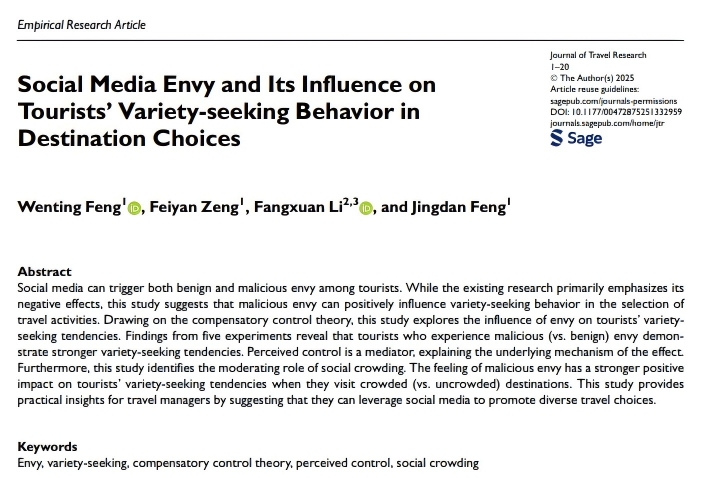 发表于《Journal of Travel Research》的论文《Social Media Envy and Its Influence on Tourists’ Variety-seeking Behavior in Destination Choices》(李芳轩为通讯作者),聚焦社交媒体中游客嫉妒情绪的双重影响路径,通过区分“良性嫉妒”与“恶意嫉妒”,考察了嫉妒情绪对游客在旅游活动中多样性寻求倾向的作用机制。研究发现,相较于良性嫉妒,恶意嫉妒反而会激发游客更强的多样性寻求行为,感知控制是关键的中介变量。