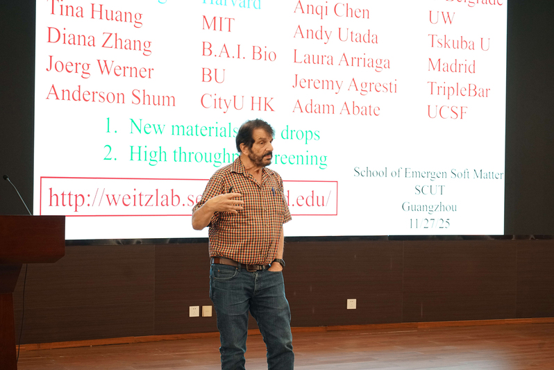 On the afternoon of November 27th, the School of Emergent Soft Matter invited Professor David A. WEITZ, a member of the American Academy of Sciences, the American Academy of Engineering, the American Academy of Arts and Science, and a professor at Harvard University, to give a talk for the Academician Lecture Hall, on the cutting-edge progress of microfluidic technology in materials science, drug delivery, enzyme engineering, and other fields under the title Microfluidic Technology: From Basic Innovation to Industrial Revolution.