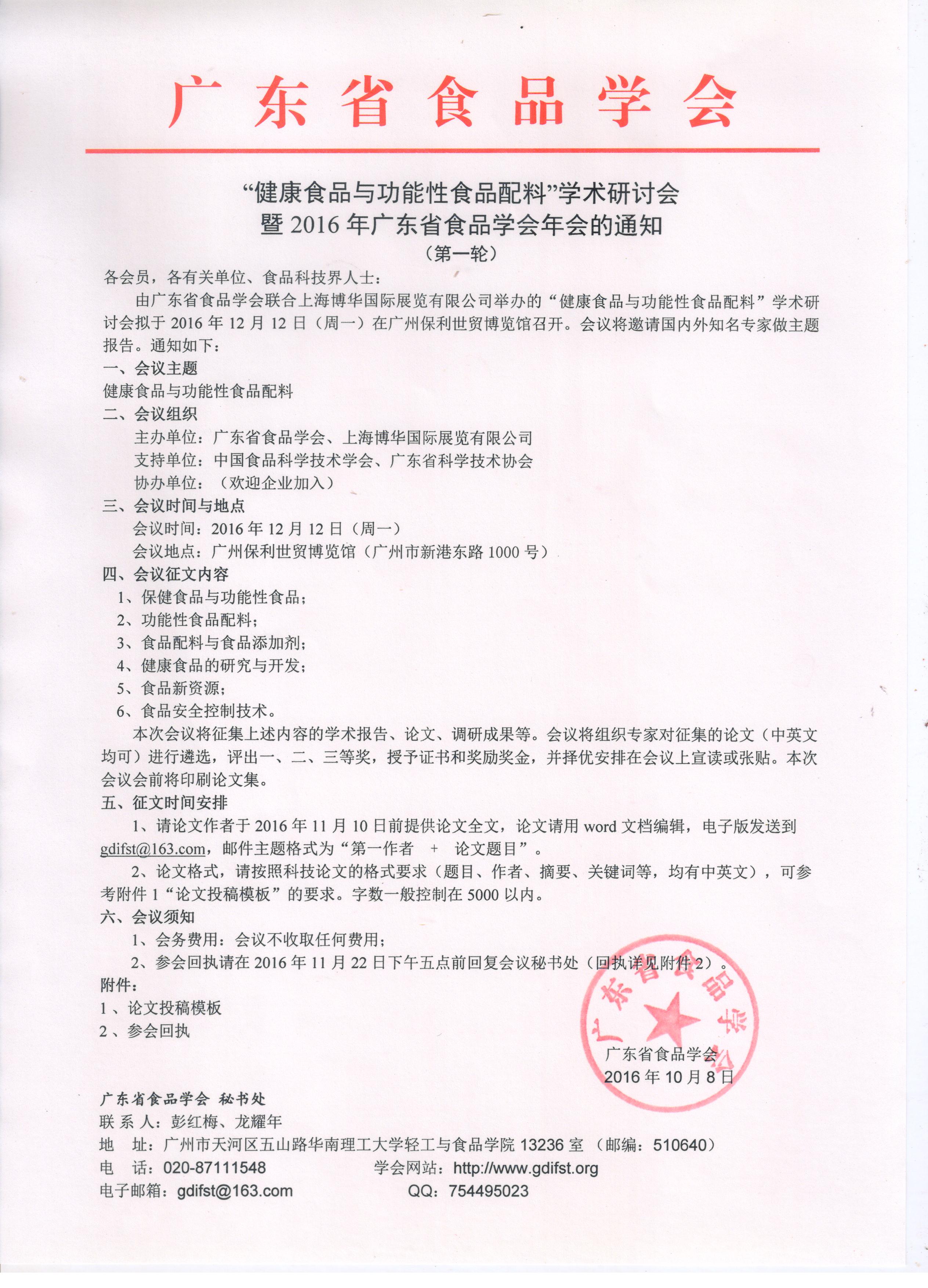 “健康食品与功能性食品配料”学术研讨会 暨2016年广东省食品学会年会的通知 (第一轮)