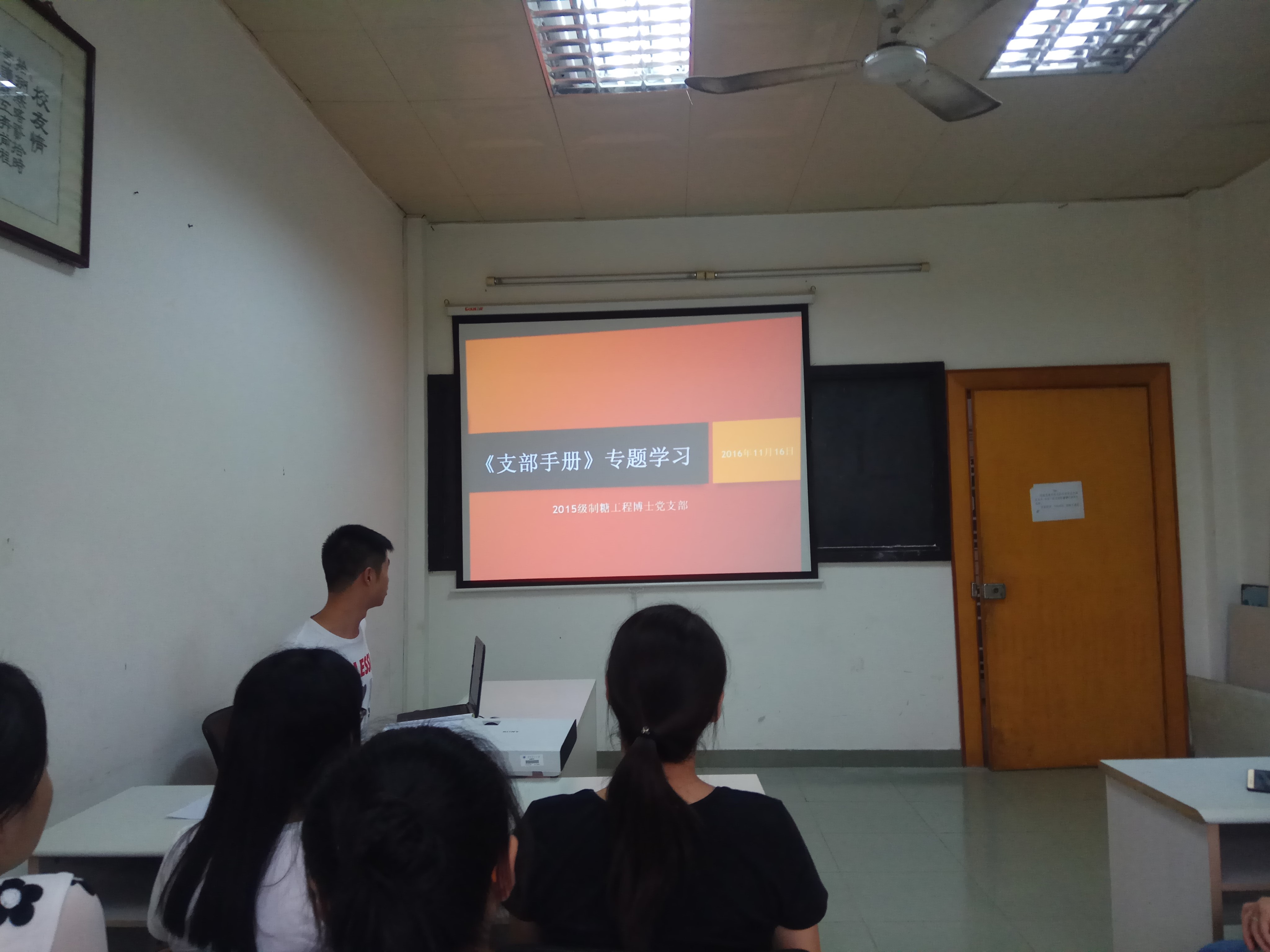 2016年11月16日食品科学与工程学院2015级制糖工程博士党支部在13号楼408室举行了支部手册专题学习会议,本支部共有党员14人,本次会议实到13人,缺席1人。