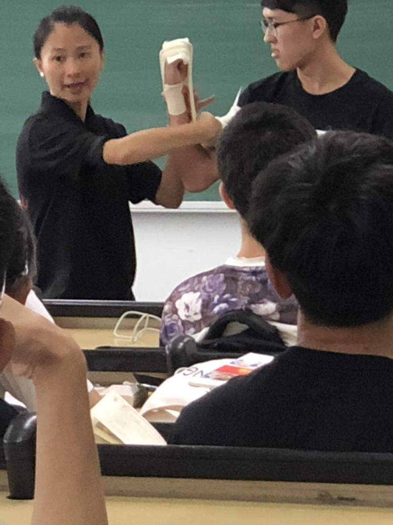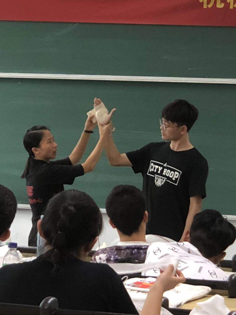 下午主要学习的是伤口包扎和骨折固定技术。在老师的指导下,我们以自己和同学为“道具”,练习了包扎手掌、断肢、头、关节,三角巾绞棒止血,手臂大悬挂等技能,教室里一时间都是“伤员”打扮。练习结束后,我们进行考试。笔试考急救知识,技能考试考心肺复苏与包扎固定止血技术。最终大家都顺利地通过了考试,结束了这场急救培训。