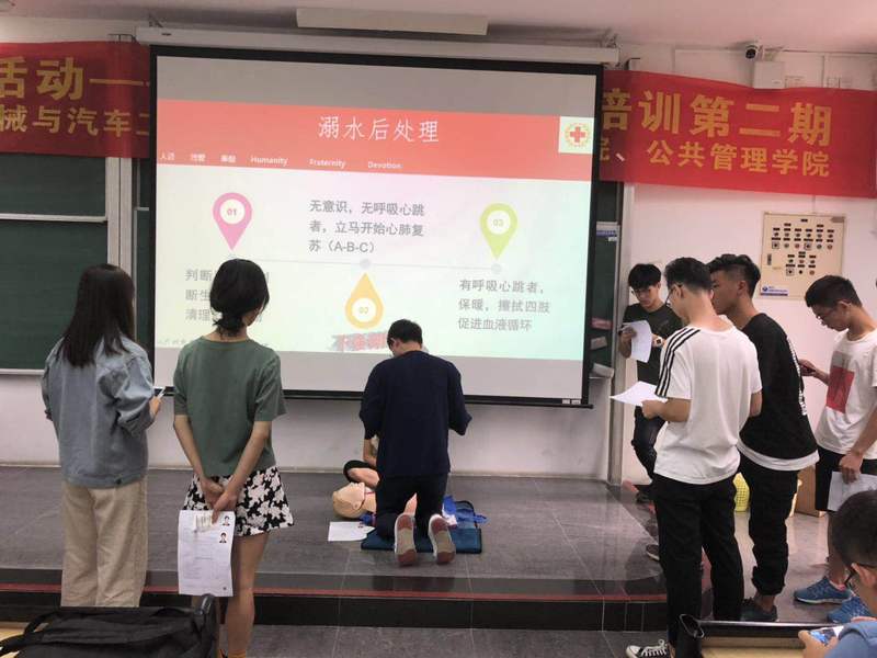 为提高同学们安全自救技能,机械与汽车工程学院,食品科学与工程学院,公共管理学院于2018年10月14日在大学城校区联合举办了安全急救员培训,培训单位为广州市红十字会,培训对象为18级班委及体育部干事,在完成培训后可获得《广州市红十字会安全急救员证书》。