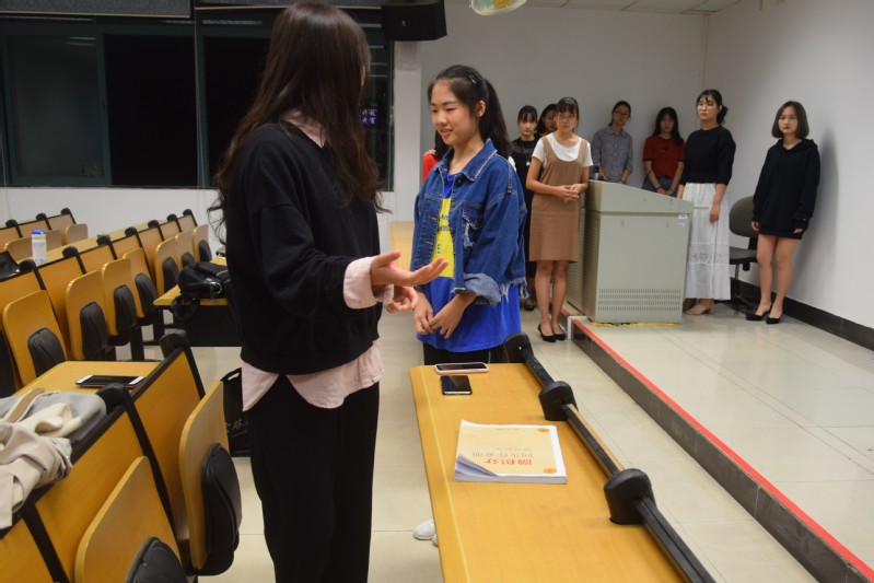 本次招新的形式是通过现教现学来选拔出新一届礼仪队的成员。培训开始,来自校会礼仪队的两位嘉宾先是为候选者讲解了礼仪队对于着装和妆容的要求。随后嘉宾介绍站姿的要求,从微笑的面部表情、抬头挺胸的自信神态到自然摆放的双手、稳稳站立的双脚。嘉宾讲解细致、亲身示范,丝毫没有因为所教导的是初学者而放松要求,而候选者们更是认真倾听,并根据指示调整自己的动作,由刚开始的不习惯到后来渐渐变得自信微笑起来。静态的站姿介绍结束后,嘉宾开始教导更深一步的内容——引导及颁奖。并且为了考核并指点大家对于引导要领的掌握情况,在场的候选者被两两分组,组内的两人分别扮演嘉宾和礼仪小姐,在讲台前模拟引导的全过程。两轮模拟结束后,嘉宾再进行动作的纠正和一些细节的提醒。