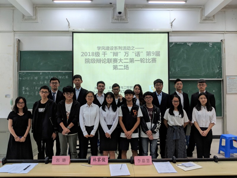 2018年10月20日与10月27日上午9时,由我院学职部举办的千“辩”万“话”院级辩论赛于33号楼101教室如期进行。参加本次比赛的是来自我院17级各个班级的组成的辩论队伍,与会嘉宾分别有华南理工大学辩论队成员张国彬,食品科学与工程学院辩论队副队长林家俊,前队长朱临丰,成员李嘉慧。