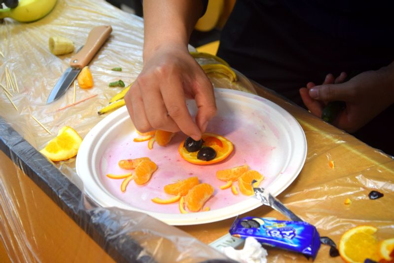 接下来迎来本次活动的高潮——小组合作制作水果DIY。尽管桌面上已经摆好了工作人员准备的水果,但是也有不少同学带了自己准备的特殊水果材料,希望能为水果DIY增添几分新意。有的小组先讨论分享制作的思路,有的小组先拿几个水果简单摆出大概的形状,还有的小组直接开始切水果。制作期间欢声笑语不断,还有同学自己也忍不住吃上几口水果。合作创造美味可口、造型独特的水果拼盘在同学们心中是一件十分愉快享受的事。水果DIY制作完成后,各组轮流介绍自己小组作品的创作思路和意图,由其它组来打分。最终综合所有环节的得分,第三组、第四组和第五组获得优秀奖。