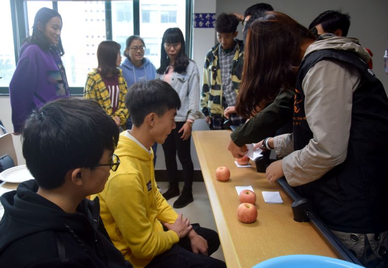 开场的游戏环节里,同学们被分为两组同时参加游戏“精算师”和“最强大脑”。在“精算师”中,每组派出的两名同学在不得借助称量工具的情况下要将苹果切出50克,仅允许误差上下浮动5克。而“最强大脑”则要求同学在两分钟内迅速观察五个苹果的差异,并在工作人员打乱后辨认出水果的编号。看似简单的游戏实则考验了同学们对重量的感知能力、对细节的观察能力以及记忆力。游戏开始时,暂时没进行游戏的小组也并没有闲下来,而是在旁仔细观察正在玩游戏的同学,并与组员讨论游戏的技巧和应对方法。游戏环节最后的“水果专家”考察了参与者对水果的了解,题目贴近日常生活,却不失新颖,选择题里的各个选项也值得推敲,主持人更是会在一旁反复确认选手最后的答案,将答题的难度推上一个台阶。