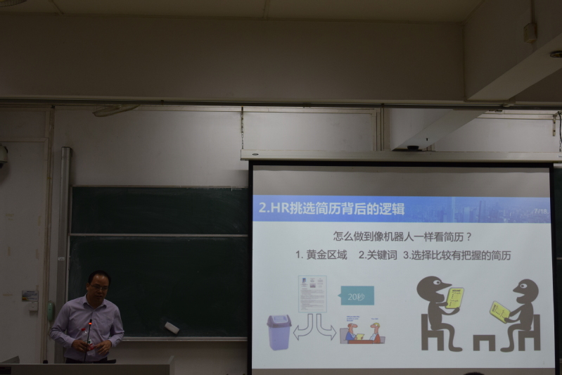 受周恒洋老师的诚挚邀请,华南理工大学学工处白争辉老师为我院16级全体本科生做了详细的简历制作培训。培训中,白老师从HR如何浏览简历入手,详述如何制作一份足以吸引HR眼球的简历。针对于绝大多数人在制作简历时不可避免发生的错误,如简历模板的选取、文字的表达、内容的取舍、排版的细节等诸多问题,白老师通过错误案例的展示为同学们一一讲解。问题的提出与解决均通过选择题的方式展现,得到了同学们的积极回应,全面调动了在场同学的积极性。